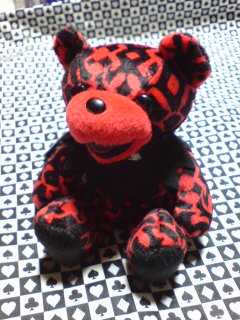 赤地に黒のよく分かんない柄。