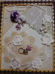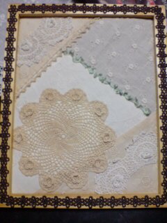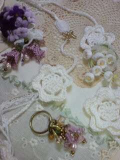 これも確か100均で買った記憶の小さなドイリー(コースター?)を紅茶・・・コーヒーだったかなぁ?で染めたものと、同じく自分で染めたケミカルレース、アンティークレースを飾りつけ。