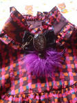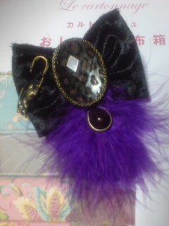 厚紙をリボン型に切りベロア生地でくるみ土台に。その上に紫のマラボーとアクリルストーンをボンド(Gクリア)で付ける。