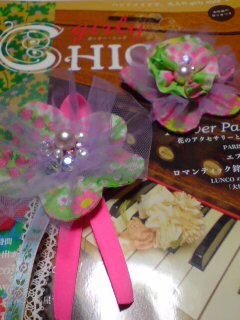 同じ布と沢山あるビーズを使ってコサージュブローチも二つ作ってみた。