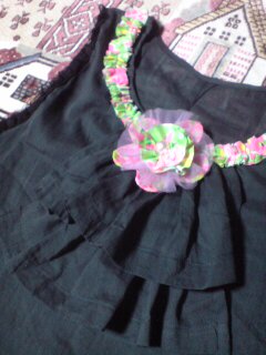 首周りにはピンクスさんの生地をバイアスに切ってギャザー寄せて縫いつけ。